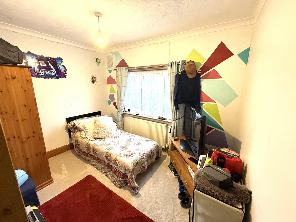 A second bedroom with a single bed and a wardrobe. A vibrant, geometric wall design adds personality to the space, making it bright and welcoming. Whilst it currently has a single bed furnished, it has ample space for a double bed.