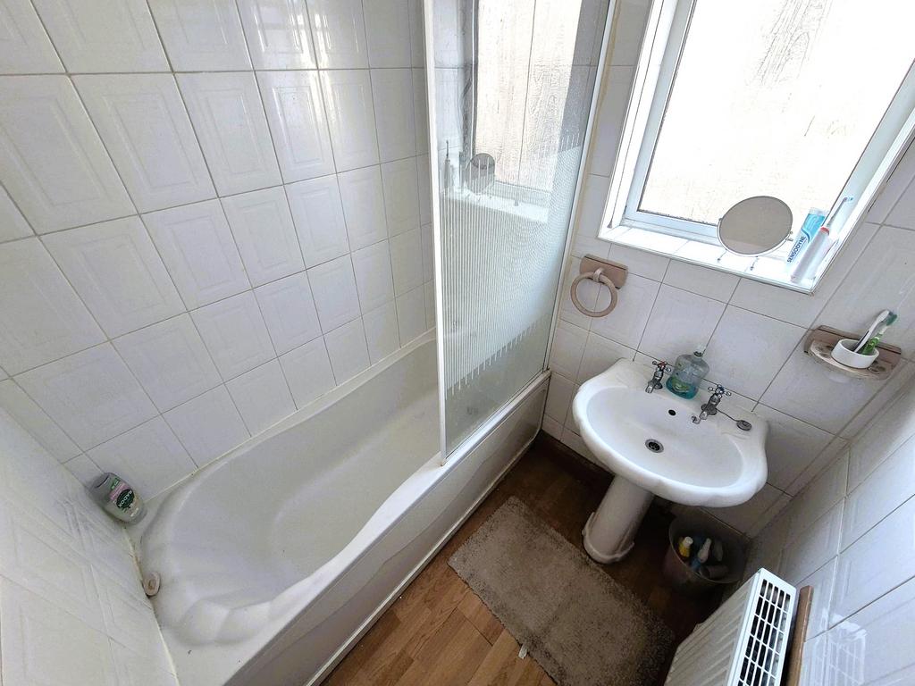 This bathroom features a traditional white suite including a bathtub with an overhead shower, pedestal basin, and a window for ventilation. Tiled walls and a radiator complete the practical and clean look.