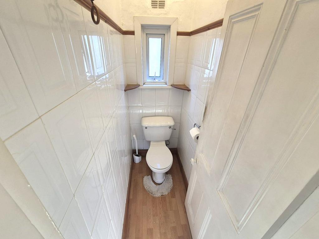 A separate WC is fitted with a white toilet and tiled walls. A narrow window adds light and ventilation to the space.