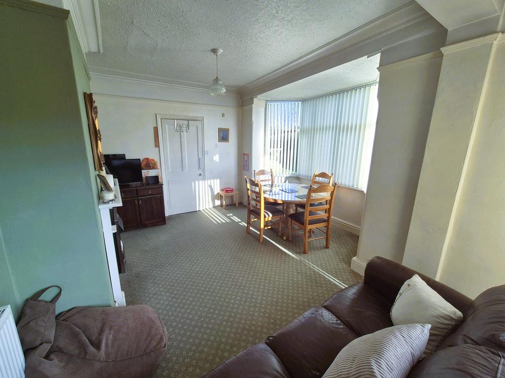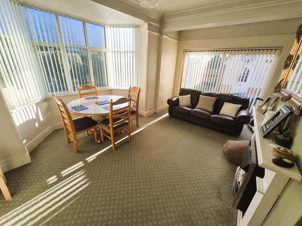 This dining room is bright and welcoming, featuring a bay window that allows plenty of daylight. The room’s size comfortably fits a dining table and chairs, making it suitable for family meals or entertaining guests. There's also sliding patio doors allowing access directly to the rear garden.