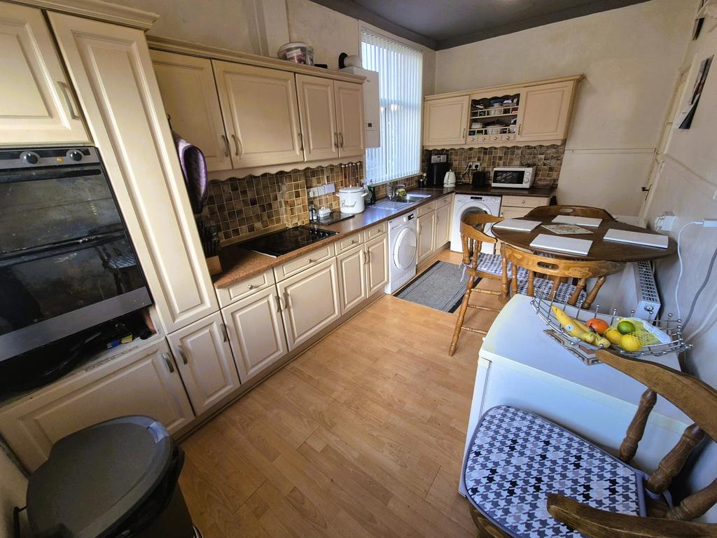 The kitchen is practical and well-equipped, featuring a good amount of worktop space and fitted cabinets. It includes essential appliances and has space for a dining area within. A window and door provide light and access to the outside.