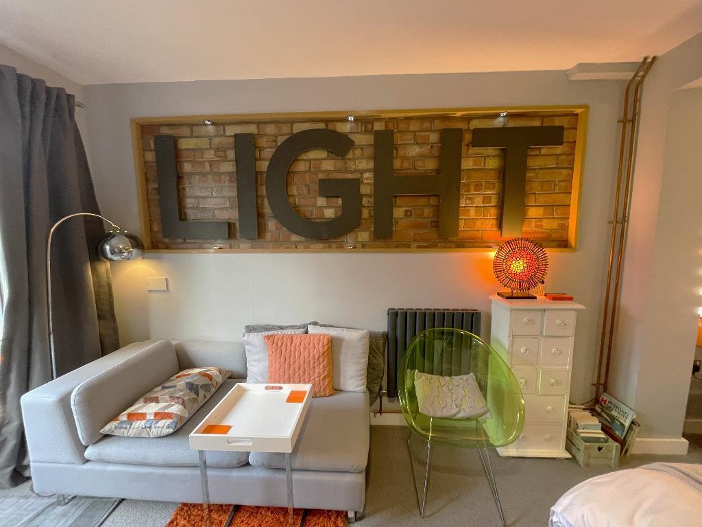 Currently forms the studio apartment with adjoining kitchen and shower room.