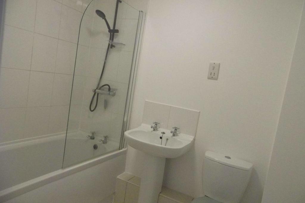 White comprising panelled bath with mixer shower over, pedestal wash hand basin, and close coupled WC, radiator.