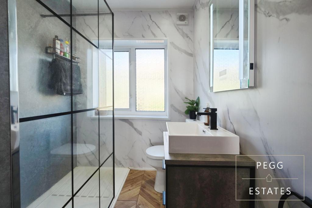 With 'walk-in' triple shower with powerful waterfall shower-head and floor-to-ceiling cladding; Low-level WC. Modern Vanity wash basin. The flooring is herringbone-styled laminate. LED digital mirror. Ceiling inset spotlights. Double-glazed obscured window to the rear aspect.