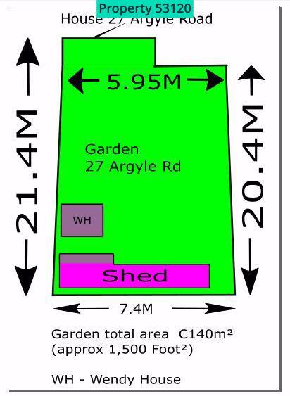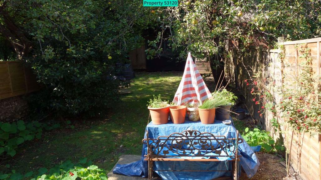 The garden is approx. 140 M² (1500 Ft²). It has a large wooden shed at the far end (the width of the garden) and a Wendy house. Currently there is a pond and 2 mature cherry trees.