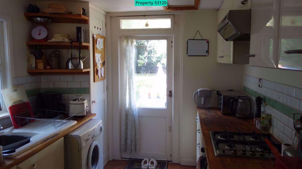 The kitchen has an electric oven and gas hobs with a 1.5 sink and drainer. There is room for a fridge/freezer and washer/dryer. There is a gas boiler for hot water and central heating. The kitchen leads into the large private garden.