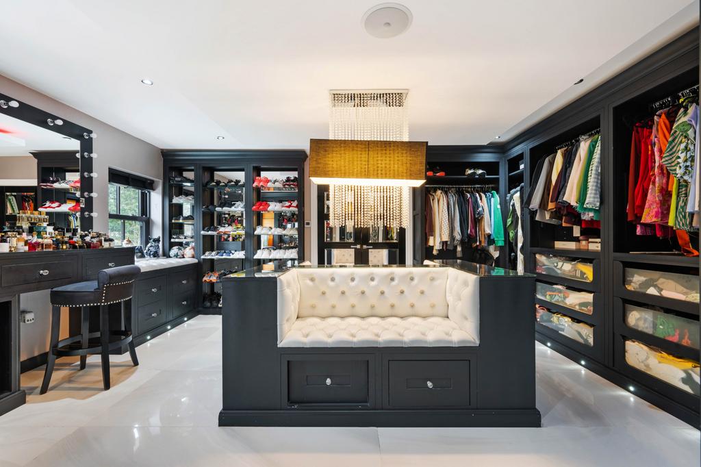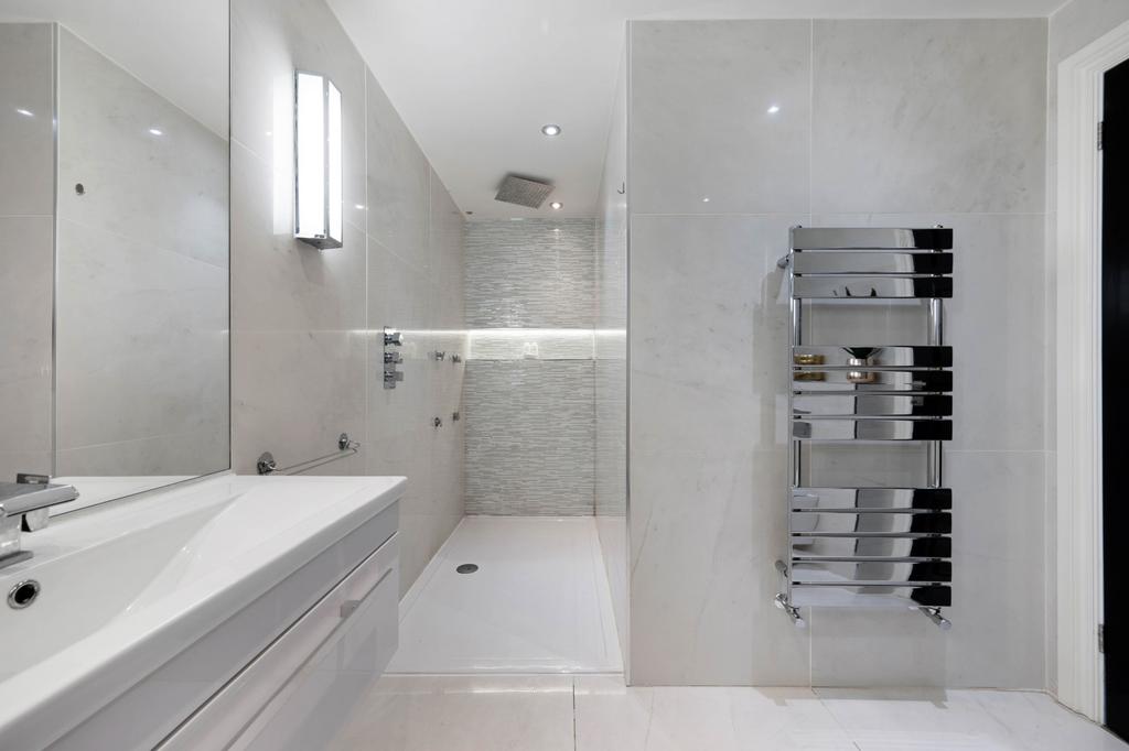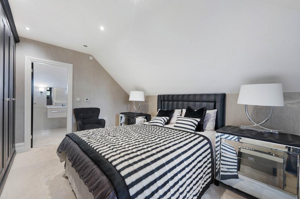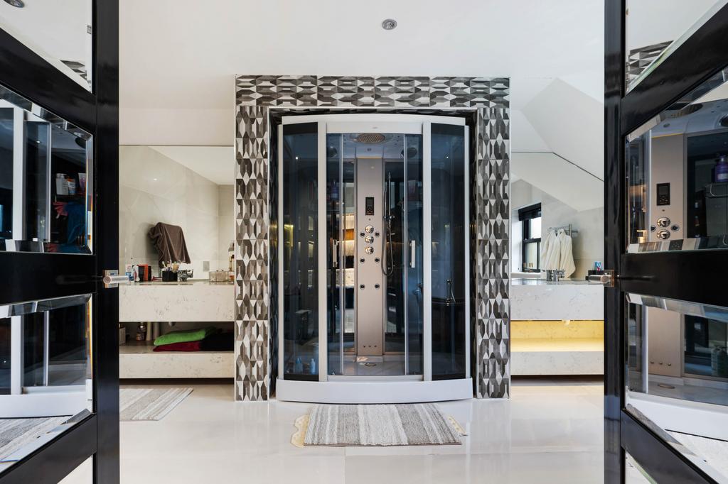 The principal suite occupies the full width of the property and offers a generous bedroom overlooking the rear garden and pool, a stunning “his and hers” dressing room with bespoke fitted furniture, and a sumptuous en-suite bathroom finished in Carrera marble. The bathroom features twin sinks, a walk-in steam shower and a striking freestanding teardrop bath.