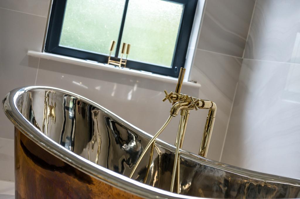 The bespoke kitchen is fitted with an extensive range of handcrafted cabinetry and Carrera marble worktops. A large central island/breakfast bar provides both a focal point and informal dining space. High-specification integrated appliances include NEFF ovens, induction hob and teppanyaki hot plate, SMEG fryer, AEG wine coolers and fridges, dishwasher, coffee machine and instant hot water tap. A separate utility room offers additional storage and laundry facilities.