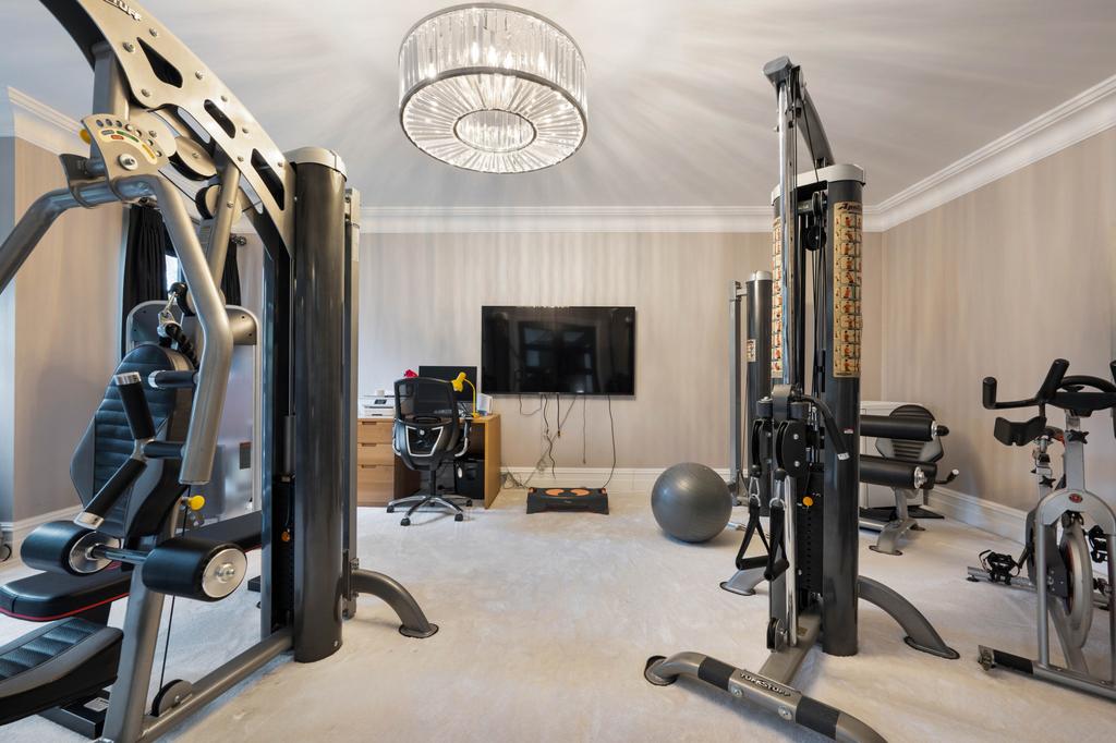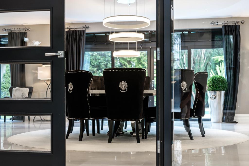 To the front of the property are two elegant reception rooms. The formal sitting room features full-length sash windows, luxurious finishes and integrated sound. The dedicated cinema room is fully equipped with drop-down screen, projector and surround sound system, offering an immersive home entertainment experience.