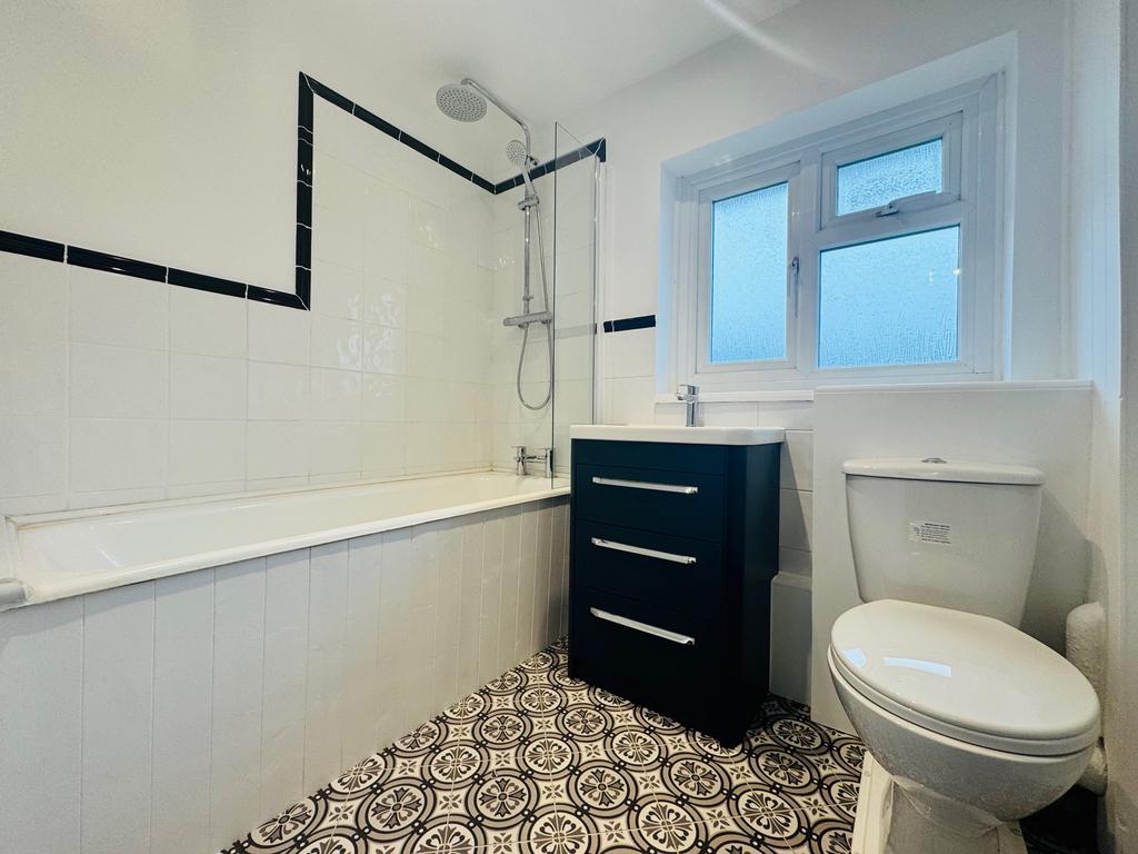 Modern newly fitted bathroom with bath and waterfall shower over.