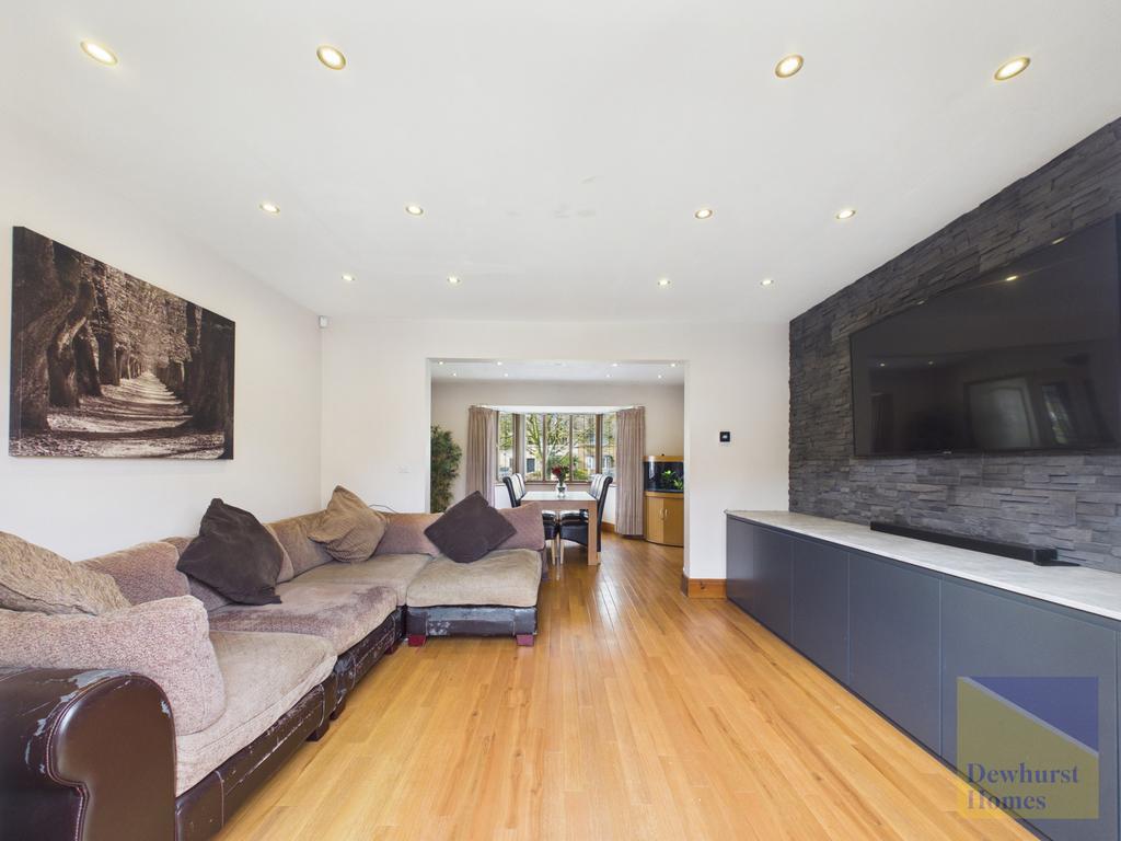 Stepping through the entrance porch, you are welcomed into a spacious hallway that immediately showcases the property’s scale and elegant flow. The proportions throughout are impressive, with high levels of natural light enhancing each space. To the front, a beautiful bay-fronted dining room offers a refined setting for entertaining — equally suited to formal dinners or relaxed family celebrations. Opening seamlessly into the rear living room the wonderful flow creates a versatile open-plan feel. The living room itself is wonderfully light and airy, with French doors that extend the living space outdoors and provide a tranquil outlook over the garden.