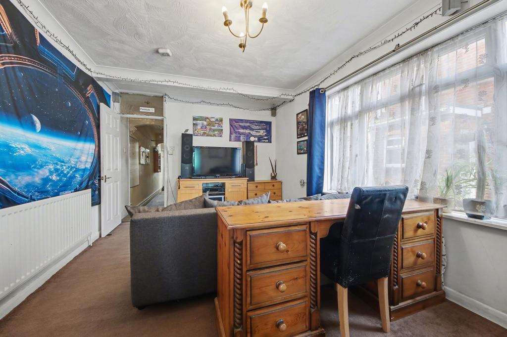 The lounge is a comfortable living space with a double-glazed window to the side, carpeted flooring, and a radiator. From here, access leads through to the kitchen.