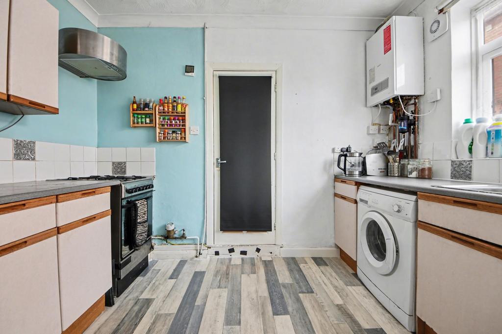 The kitchen is fitted with a range of wall and base units with roll-top work surfaces and a stainless steel sink. There is vinyl flooring, a double-glazed window to the side, and space for a washing machine, slimline dishwasher, and cooker. To the rear, an inner hallway provides space for a fridge freezer, access to both the shower room and separate WC, and a UPVC double-glazed door offering access to the rear.