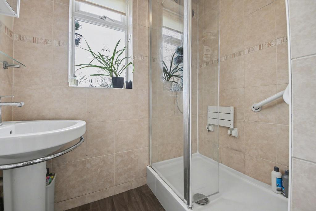 The shower room comprises a shower cubicle, wash hand basin, radiator, vinyl flooring, and an obscure double-glazed window to the rear.