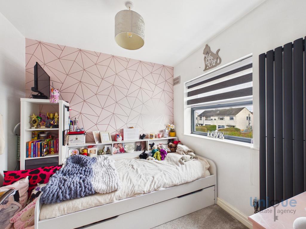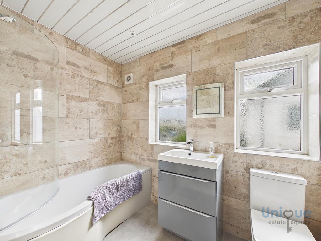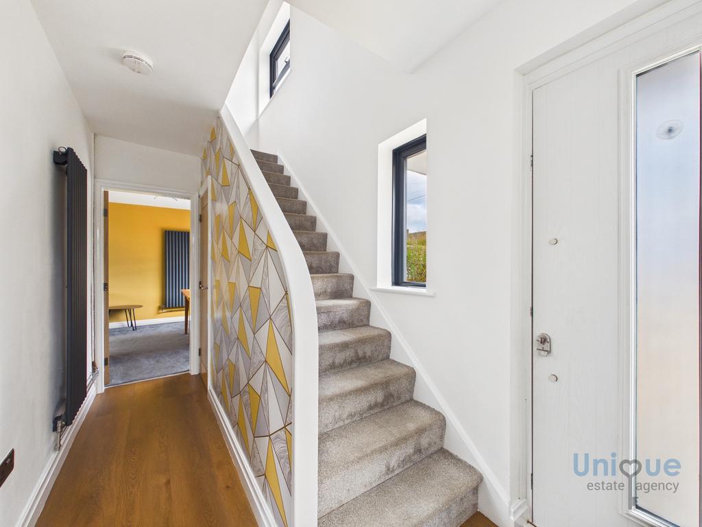 Recently fitted composite front door opens on to the hallway, the house also benefits from recently fitted UPVc double glazed windows. Impressive oak doors lead into the following accommodation. The kitchen has a wide range of white wall and base units, along with complementary worktops, cupboard housing combi boiler. There are two excellent size storage/pantry areas in the kitchen, door leads on to the extensive rear garden. The highlight of the downstairs is a beautifully presented open plan lounge diner, this room has a lovely dual aspect with windows to the front and rear, along with a superb feature wall.