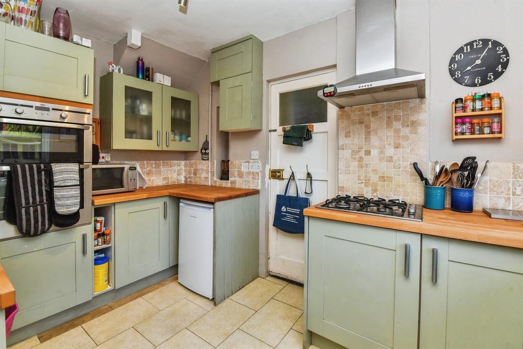 Fitted kitchen comprising a good range of wall and base units with wooden work surfaces over, stainless steel one and a half bowl sink/drainer with mixer tap. Integrated oven and grill, integrated four ring gas hob with extractor fan over, plumbing for washing machine and space for under counter fridge. Windows to the rear and side aspect, door leading to the rear hall, tiled flooring and a radiator.