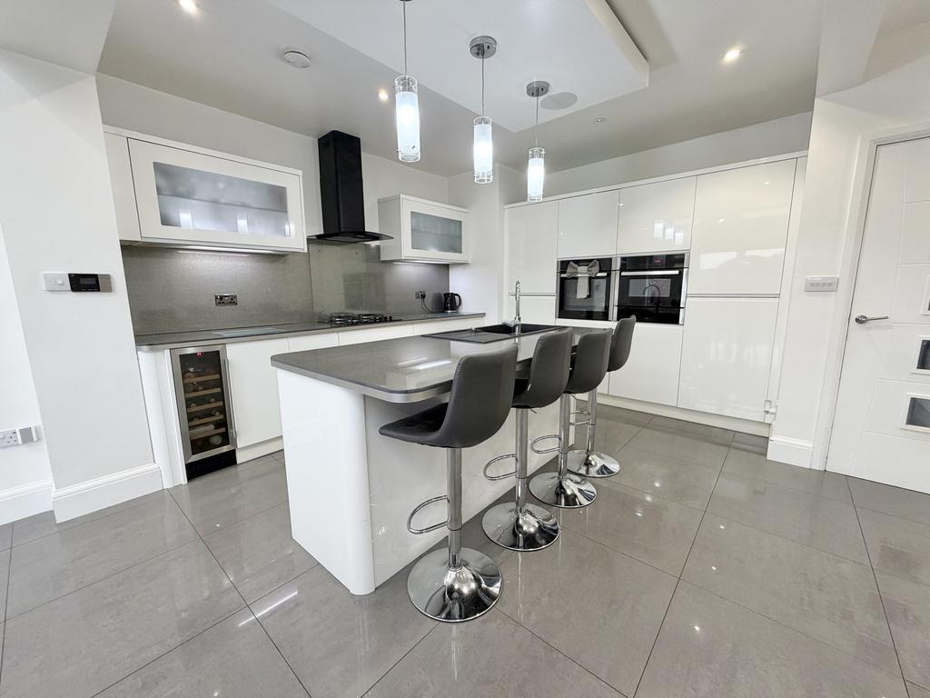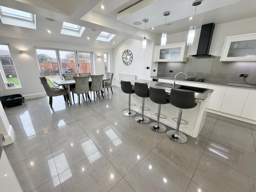 UPVC double glazed bifold doors to the rear aspect, UPVC double glazed windows to the rear aspect, modern fitted kitchen with a range of wall and base units and complementary work surfaces, one and half bowl sink and drainer with mixer tap, a range of integrated appliances including fridge freezer, dishwasher, oven, hob, extractor, microwave/grill, wine fridge and heated draw. The Kitchen is also plumbed for a washing machine, has space for dryer, has under floor heating, speakers and two radiators.