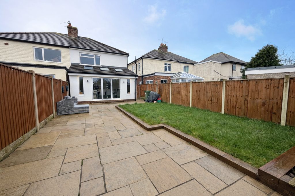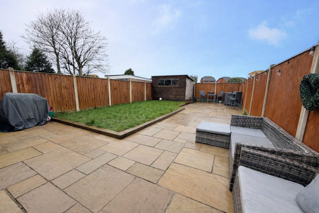 Good size rear garden, mainly laid to lawn with paved patio area and shed.