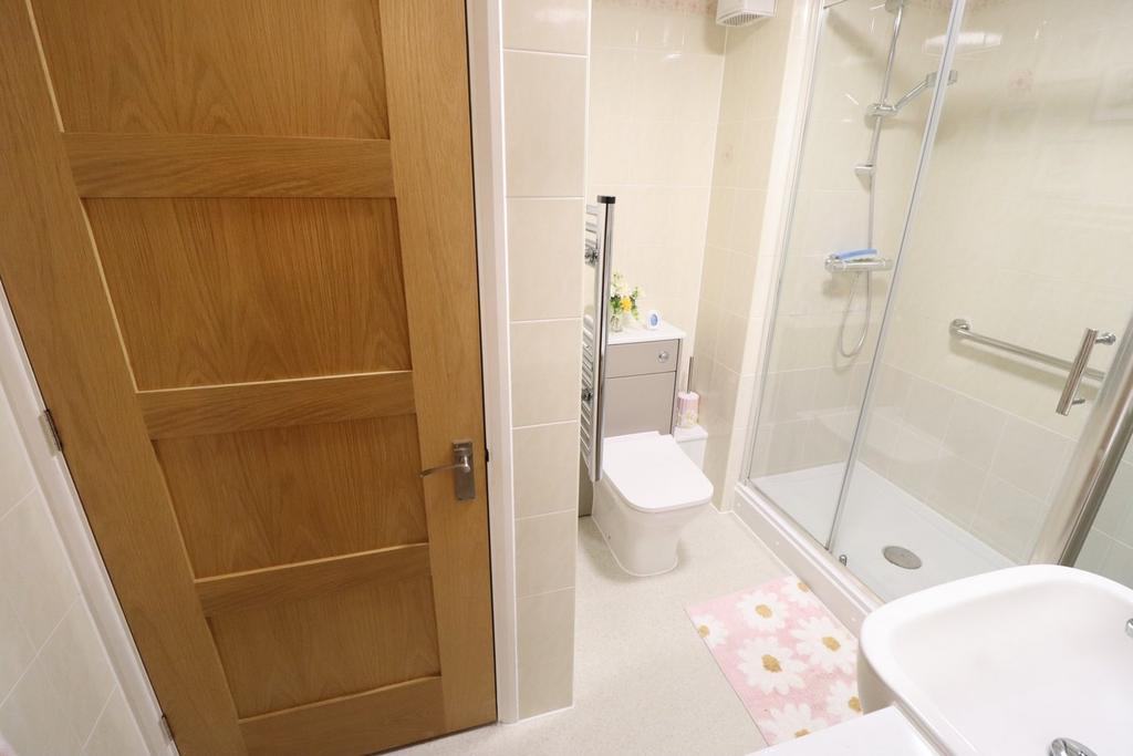 Spacious area offering a modern three piece white suite comprising of low level concealed cistern WC with dual flush mechanism. Vanity hand wash basin with vanity cupboards under with stainless steel mixer taps. Large walk in shower enclosure accessed via a glass screen sliding doors. Stainless steel wall mounted mixer shower. Coved ceiling. Wood effect vinyl flooring. Extractor fan. Wall mounted Electric heater. Additional recently installed chrome heated towel rail. Tiled walls. Wall mounted vanity light with integral shaver point. Deep built in airing cupboard housing hot water cylinder, Fuse board, and Electric meter. Plus ample storage over.