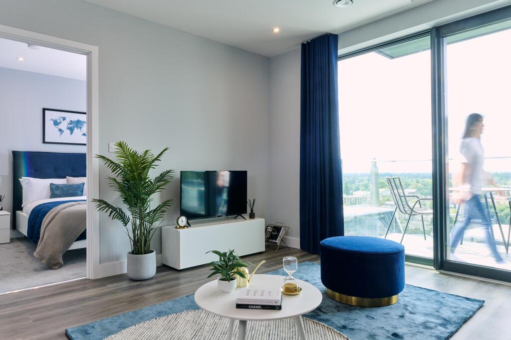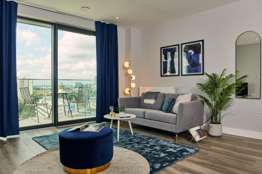 Light and spacious with floor to ceiling windows and curtains. Plush 2-seater sofa, media storage unit, and coffee table from BoConcept.