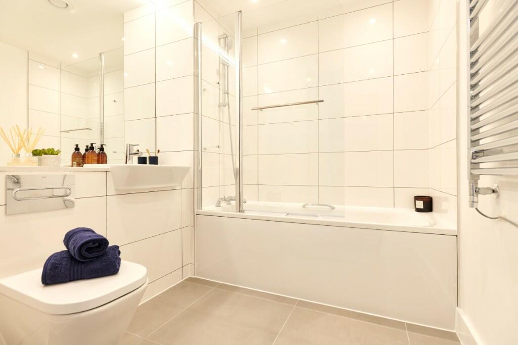 Bathroom with contemporary tiling throughout. Bathtub with shower, WC and heated towel rail.
