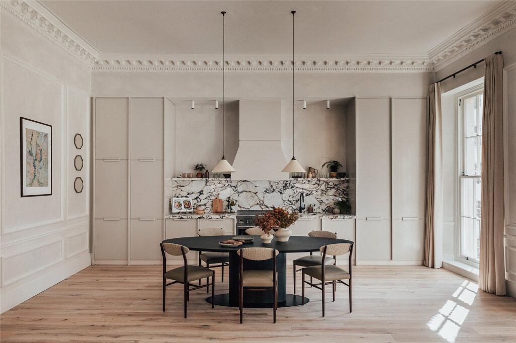 The apartment features expansive living areas enhanced by bespoke joinery, engineered timber flooring and natural stone finishes throughout. A contemporary marble kitchen fitted with integrated Miele appliances opens seamlessly into the reception space, while the bathrooms are finished with elegant stone detailing and underfloor heating for added comfort. Designed by Albion Nord, the interiors reflect a timeless aesthetic that balances modern design with Mayfair’s traditional character.