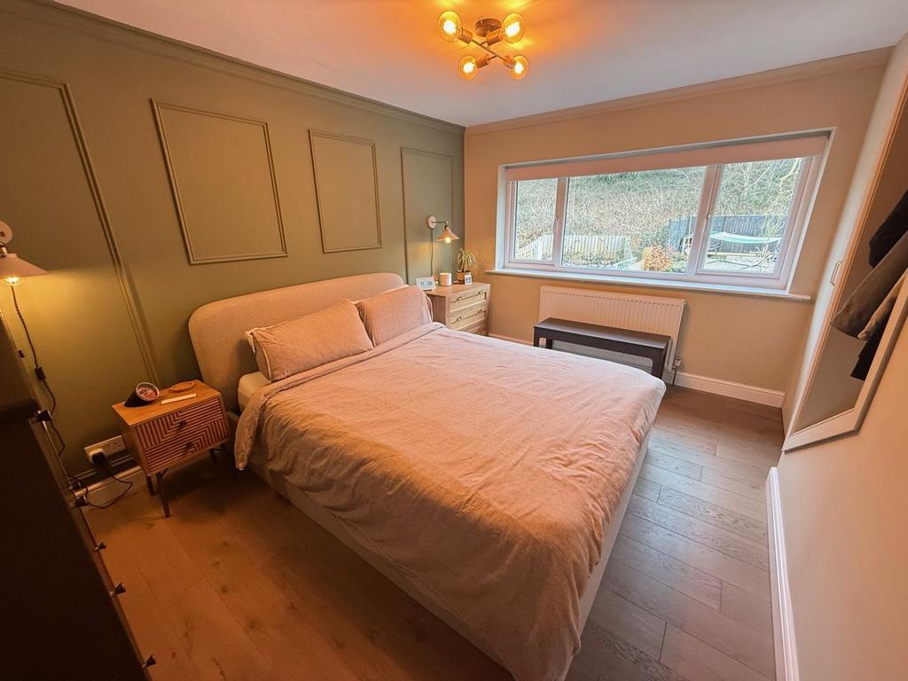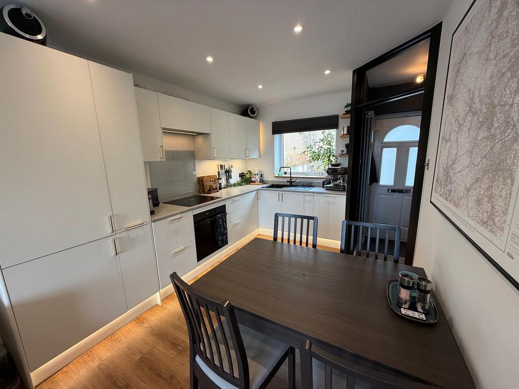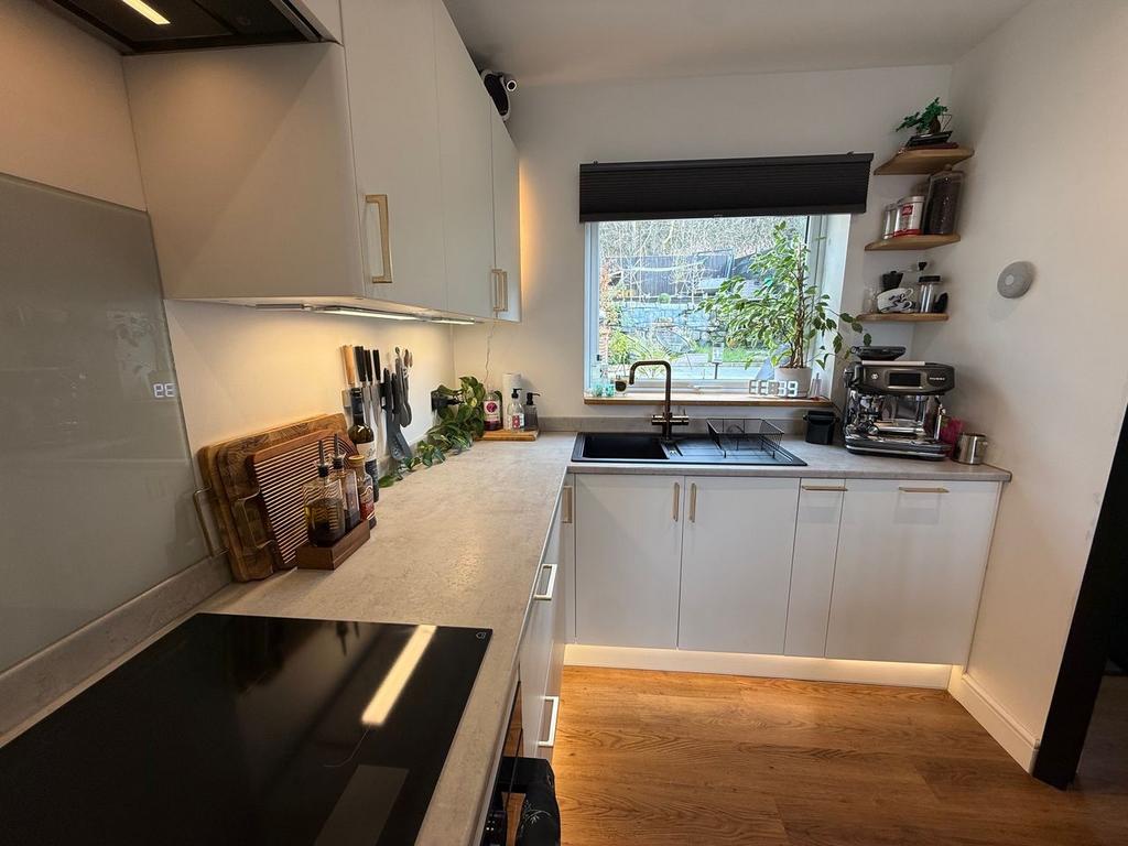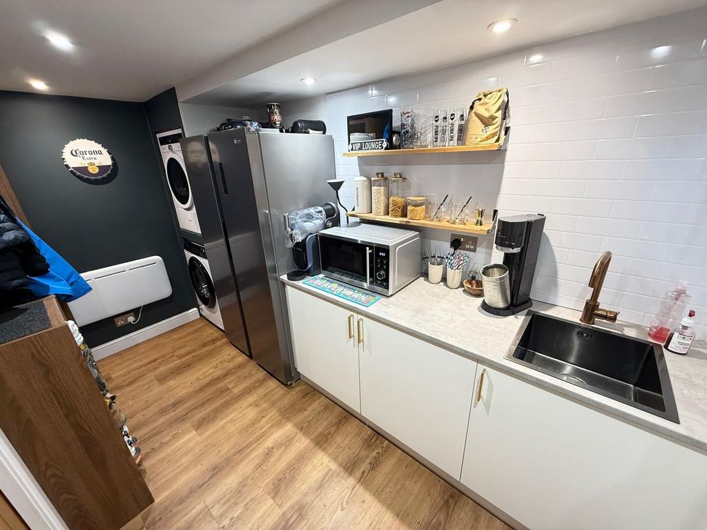 With modern sink unit, hot water mixer tap, excellent range of quality wall and base units with laminated work surfaces and pelmet lighting. Integrated induction hob with glazed splashback, integrated Samsung smart oven/air fryer, extractor with lighting, plinth lighting, built in pull out pantry cupboard, integrated dishwasher and integrated fridge freeze, double radiator, laminated flooring and LED inset spotlights.