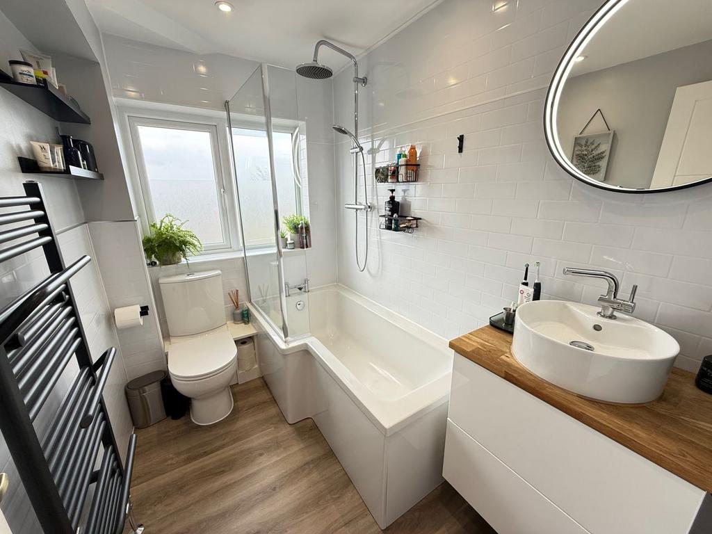 Part tiled with three piece quality white suite incorporating shower bath with mixer shower and oversized shower head, circular vanity wash hand basin with underbuilt storage and solid wood work surface. Low flush wc, inset spotlights and heated towel radiator, laminated flooring and illuminated circular wall mirror.