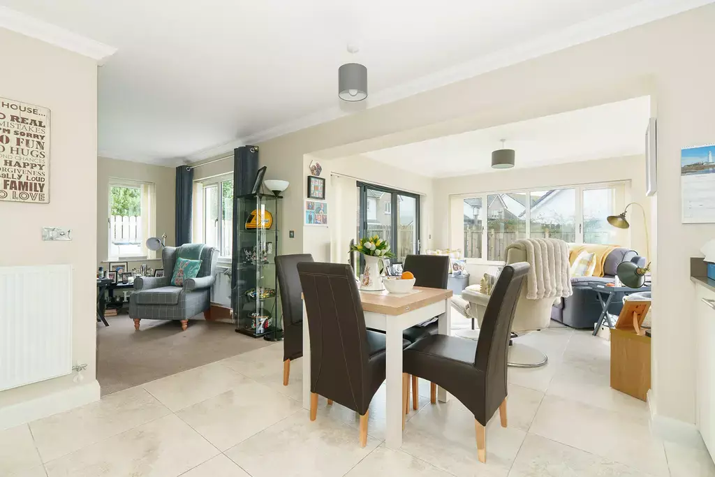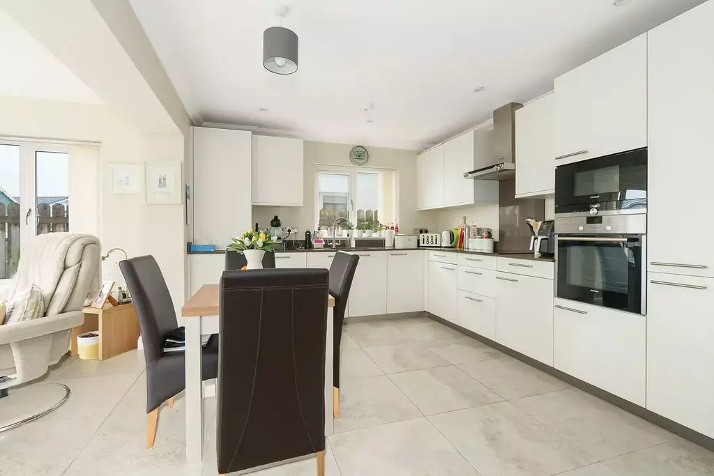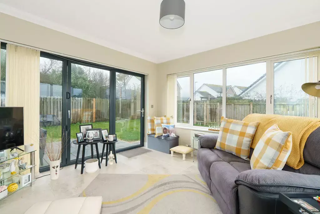 A welcoming entrance hall with two useful storage cupboards leads into an attractive L-shaped open-plan living space incorporating a modern and stylish kitchen. A particular highlight is the stunning sun room, a rarely available feature within this development, with folding doors opening onto the south-west facing rear patio—perfect for indoor-outdoor living and entertaining. The property also benefits from an attached garage, another uncommon and valuable addition.