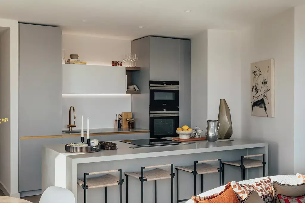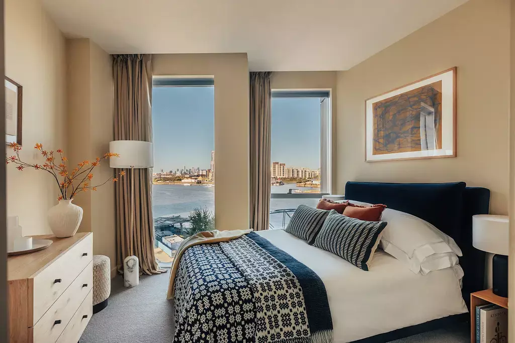 The property features a bright and expansive open-plan living and dining area, enhanced by floor-to-ceiling windows that maximise natural light and frame impressive panoramic views of the river. The contemporary kitchen is finished with integrated appliances and sleek cabinetry, seamlessly connecting with the main living space and creating an ideal environment for entertaining or everyday living.