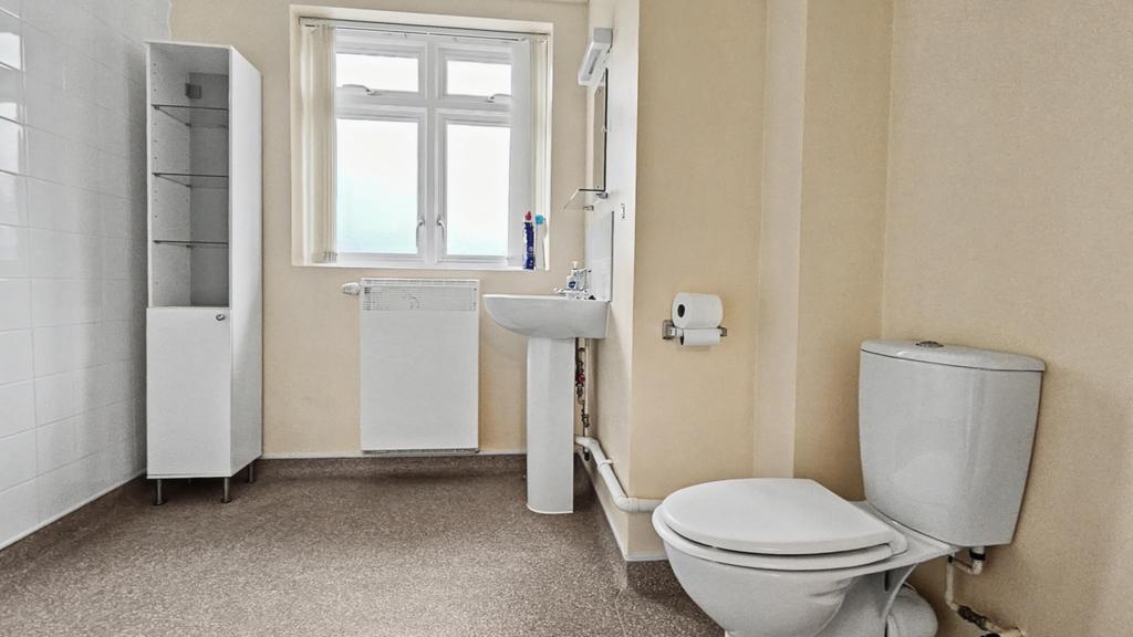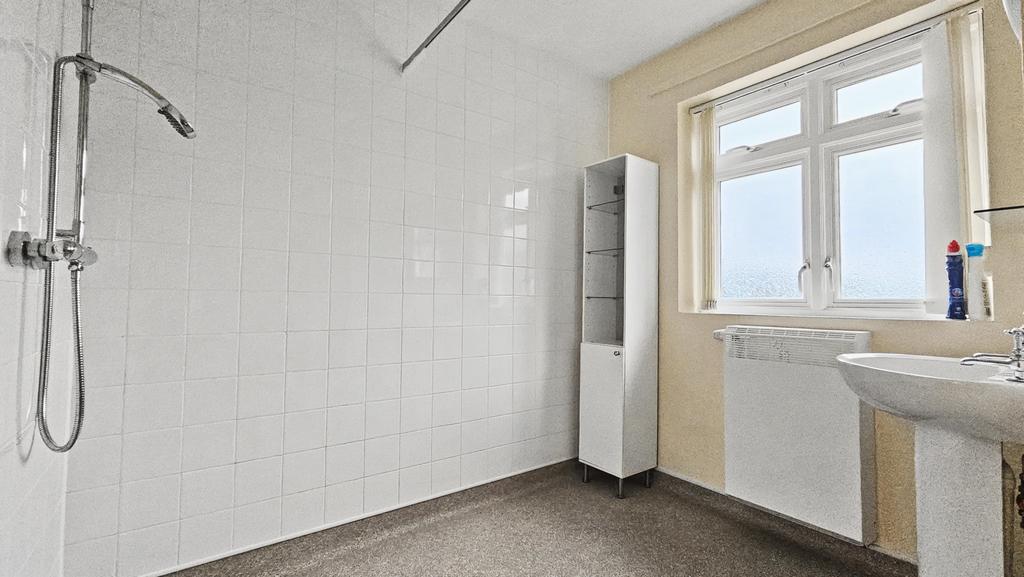 SHOWER WET ROOM with vinyl floor, part tiled walls, shower area, white washbasin and WC, wall mirror, and shaver point. Rear window and extractor fan.
