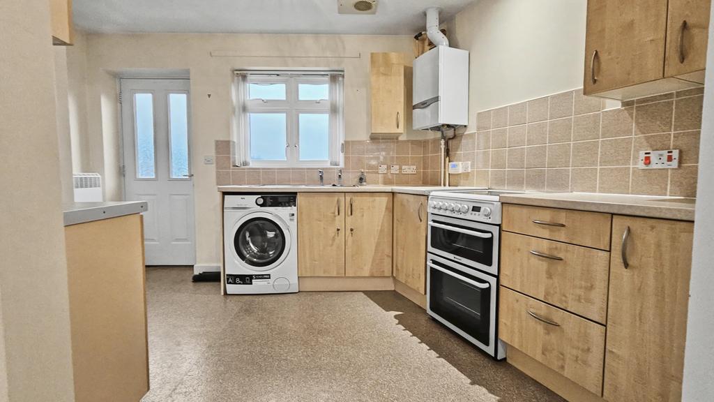 KITCHEN (3.2m 2.57m approx)(10'4" x 8'4"approx) with vinyl floor, range of built-in units including five floor cupboards (with drawers), six wall cupboards, laminate worktops, sink unit, spaces for fridge/freezer, cooker, washing machine, radiator, extractor fan, seven power points, rear window, and door to the rear garden area.