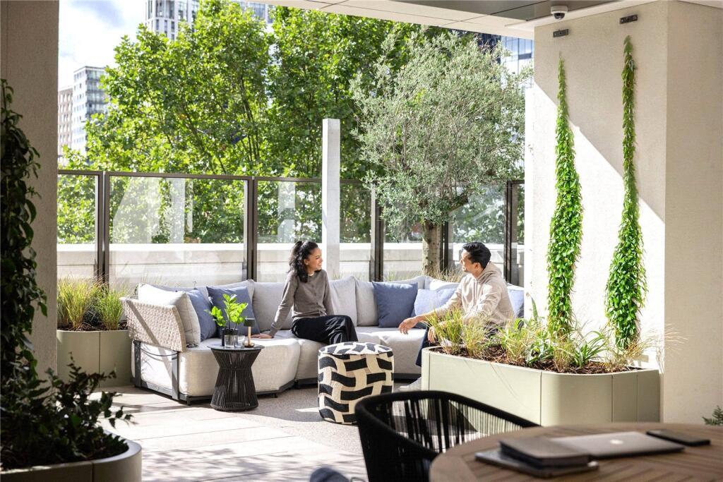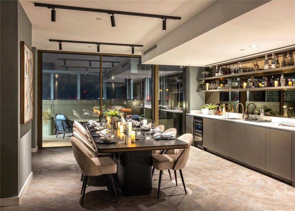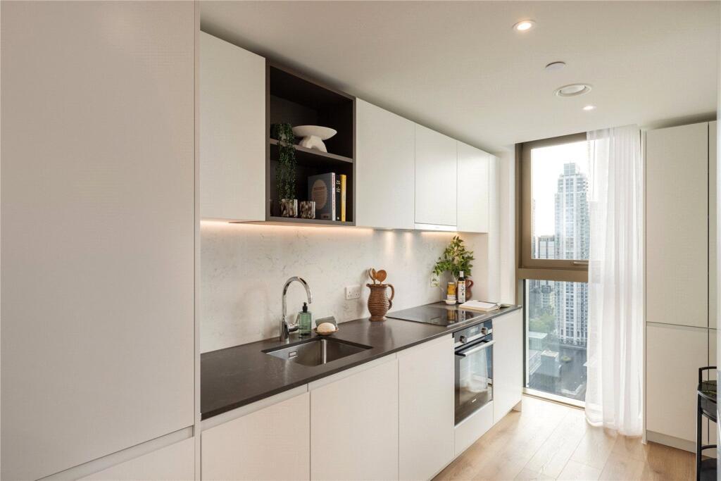 The apartment features a bright open-plan living and dining area, enhanced by large windows that allow natural light to flow throughout the interior. The modern kitchen is finished with high-spec Siemens appliances and composite stone worktops, creating a stylish and functional space for everyday living and entertaining. The living area extends to a private balcony, providing a perfect place to relax while enjoying views towards Canary Wharf and the surrounding skyline.