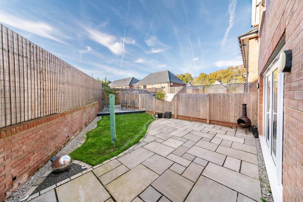 Externally, to the rear, the property features an Indian stone-flagged patio, ideal for alfresco dining and barbecuing. The patio area leads onto a lawn, and at the bottom of the garden is a fabulous, raised, composite decking area. The garden has part-walled and part-fenced boundaries, recessed footwell lighting around the perimeter, external security lights with motion sensors, an external tap, and an external double power socket. The rear garden is particularly private and enjoys the afternoon and evening sun.
