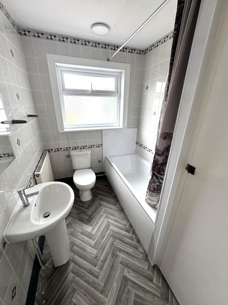 Double glazed window to rear, panelled bath with mixer spray unit, pedestal hand basin, low level WC, tiled walls, loft access, airing cupboard with wall mounted boiler, radiator:
