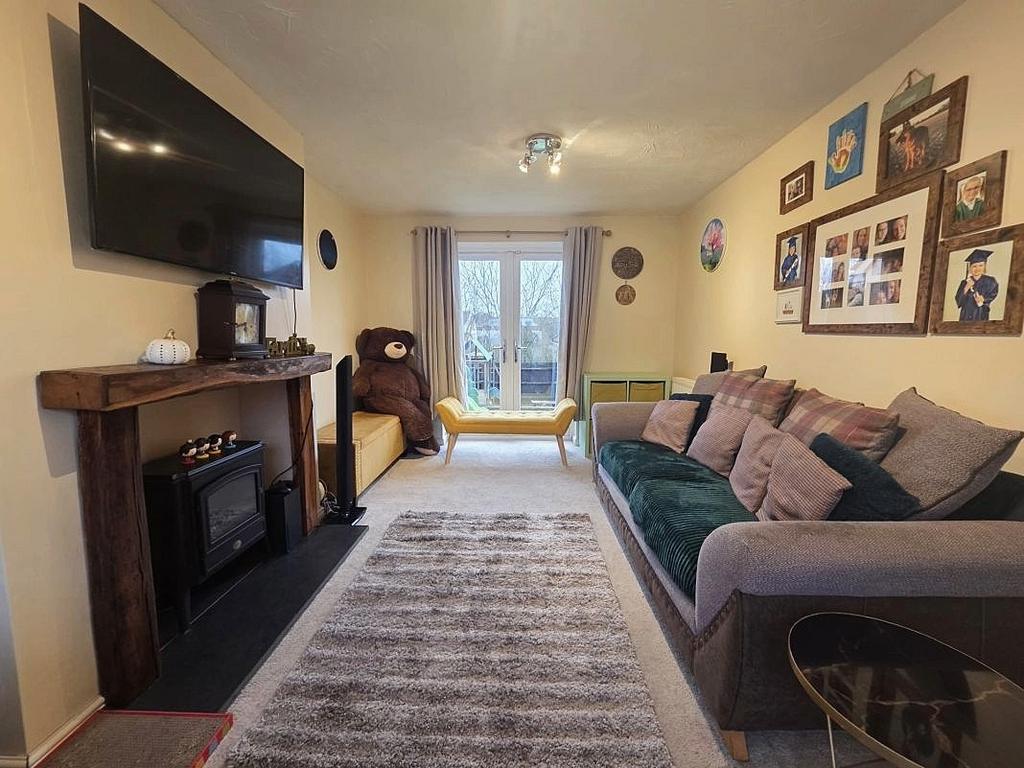 Lounge 15’9 x 10’ (4.8m x 3.05m): Double glazed window to front elevation, double glazed French doors opening to rear garden, feature fireplace with stone hearth, two radiators.