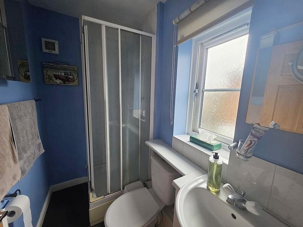 En-Suite Shower Room: Obscure double-glazed window to side elevation, low level WC, vanity wash hand basin with cupboard beneath, shower cubicle with glazed doors and tiled splash back, radiator.