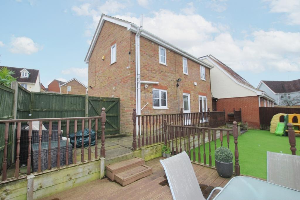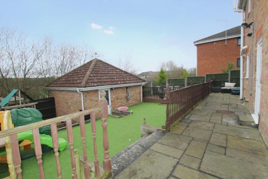 The Rear Garden is enclosed to timber fencing with gated side pedestrian access, paved patio area, artificial grass, further timber decked area, exterior lighting, pathway leading to personal door to:
