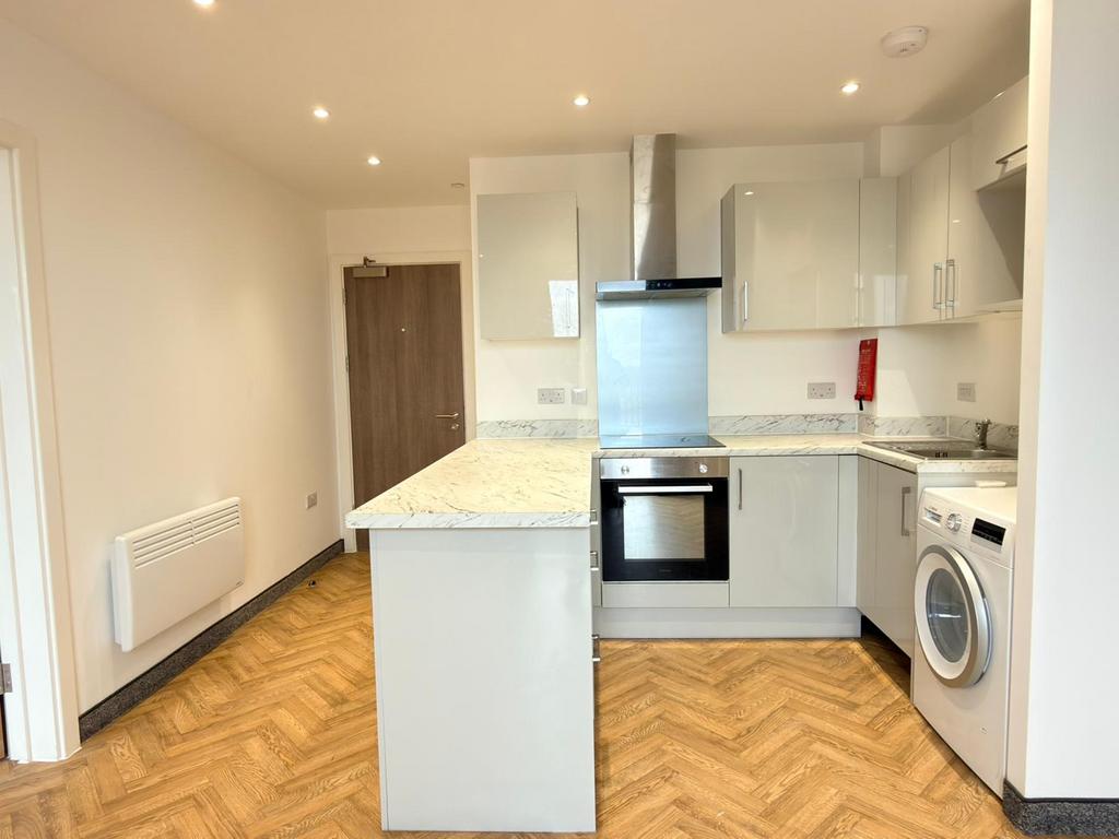 The apartment features a sleek, fully fitted kitchen equipped with modern appliances, seamlessly flowing into a spacious open-plan living area. Large doors open out to a private balcony and expansive terrace, providing an excellent outdoor space for relaxing, entertaining, or enjoying city views. The property further benefits from lift access, a generous double bedroom with a fitted wardrobe for ample storage, and a stylish contemporary bathroom finished to a high standard. Offered unfurnished, the apartment provides a blank canvas, allowing you to personalise the space to suit your lifestyle.