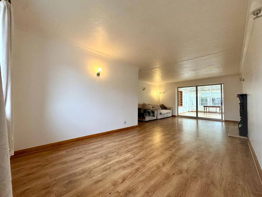 Gas fireplace with marble hearth and wood surround. Wall lights. Laminate flooring. Sliding doors leading to conservatory. Window to front
