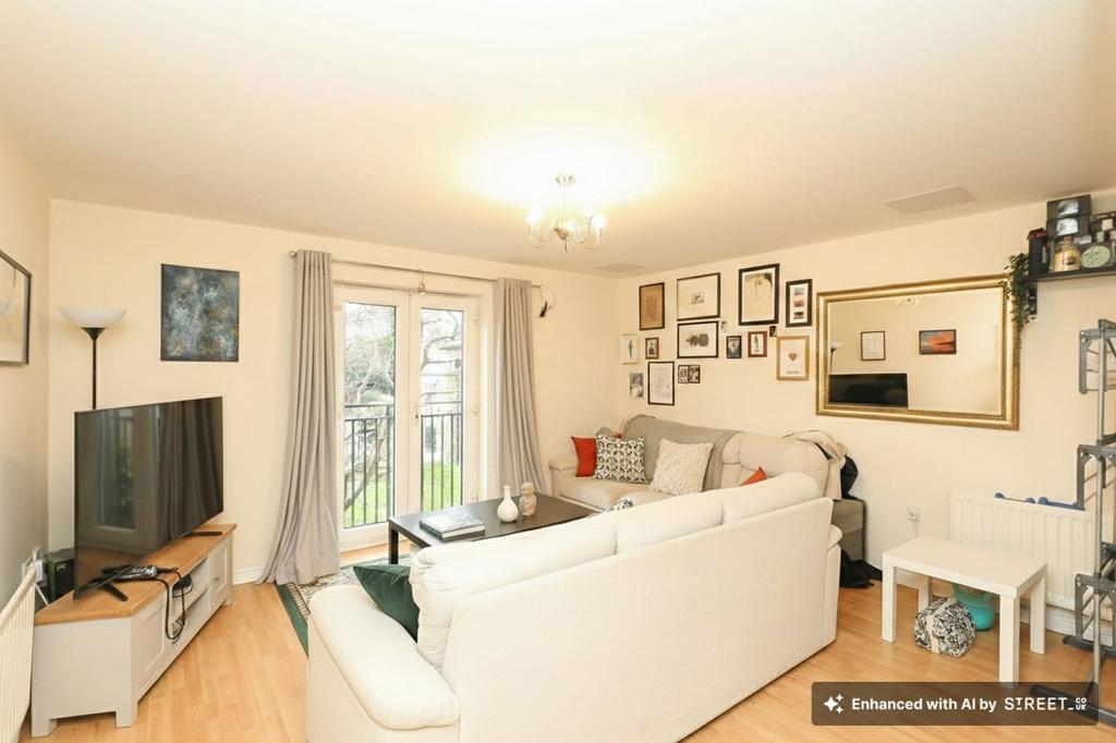 Accessed via a communal entrance, the apartment opens into a welcoming hallway that sets the scene for spaciousness throughout the apartment. The main living space is arranged in an open-plan layout, combining a kitchen, dining and lounge area, in a way that feels both sociable and practical. A Juliet balcony enhances the space, while the fitted kitchen offers a range of integrated cooking appliances. The layout lends itself well to modern living, with flexibility for entertaining, dining, or even a home working setup.