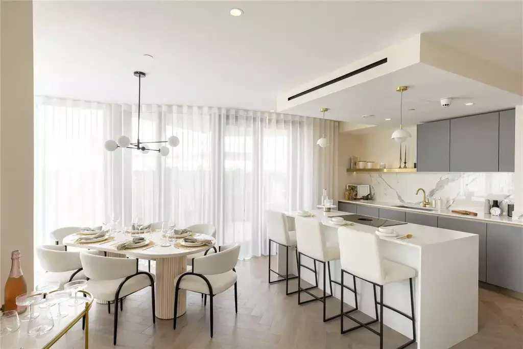 The spacious open-plan reception and dining area is filled with natural light and designed for both relaxing and entertaining. The modern designer kitchen is fully fitted with high-quality integrated appliances and premium finishes. The principal bedroom features a luxurious en-suite bathroom, while two additional bedrooms provide flexible space for family, guests or a home office.