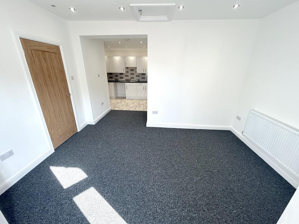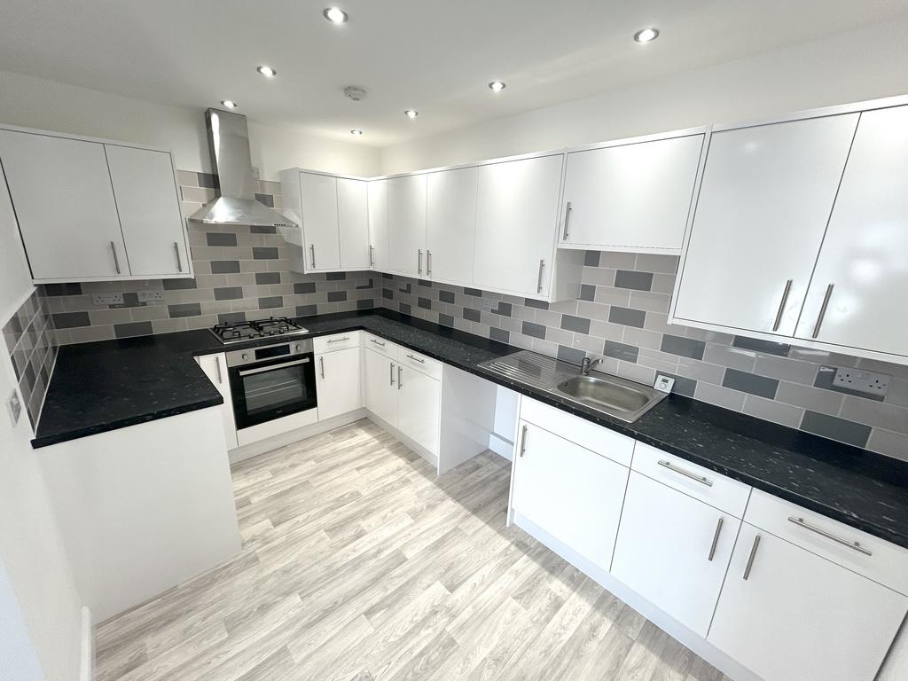 The property itself has been finished to an exceptional standard, featuring crisp white decor, contemporary recessed LED spotlighting, and high-quality new flooring throughout. Upon entering, you are greeted by a bright entrance hall complete with a very large built-in storage cupboard. This leads into a welcoming living area bathed in natural light from a large bay window. The space flows perfectly into a partially open-plan modern kitchen, which has been designed for both style and functionality. It boasts sleek white cabinetry, striking black granite-effect worktops, and a sophisticated grey-toned tiled backsplash, offering ample space for meal preparation and integrated appliances.