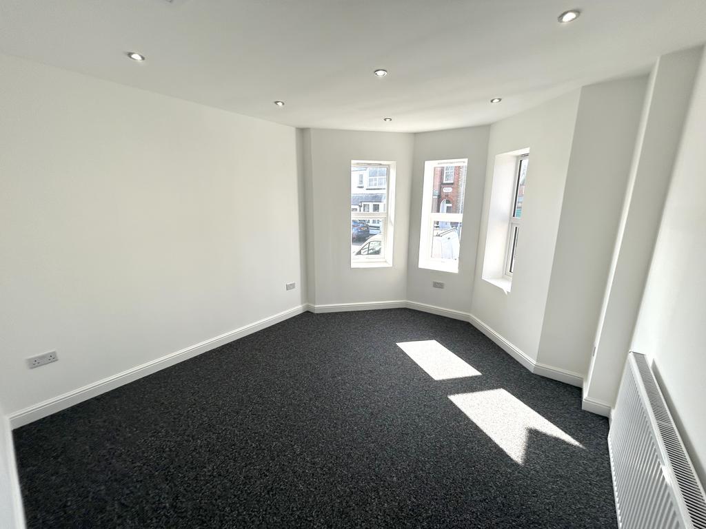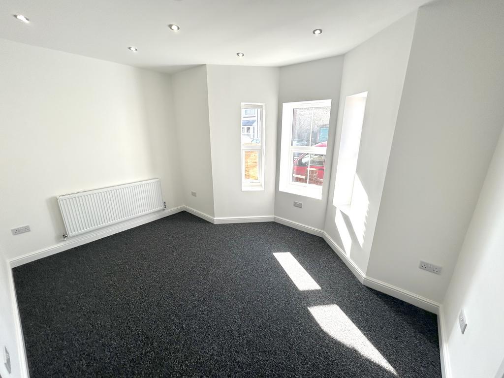 The accommodation offers two spacious double bedrooms. The front bedroom is particularly impressive, featuring a wide bay window that floods the room with light, while the rear bedroom provides a quiet retreat with plush carpeting and built-in storage.