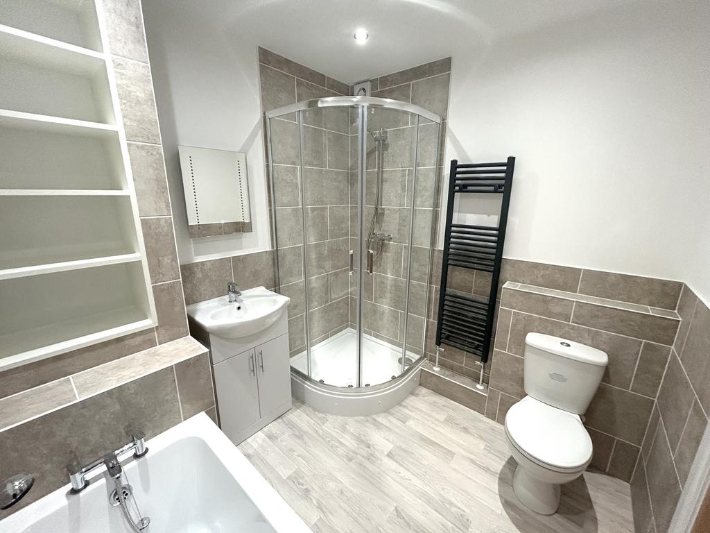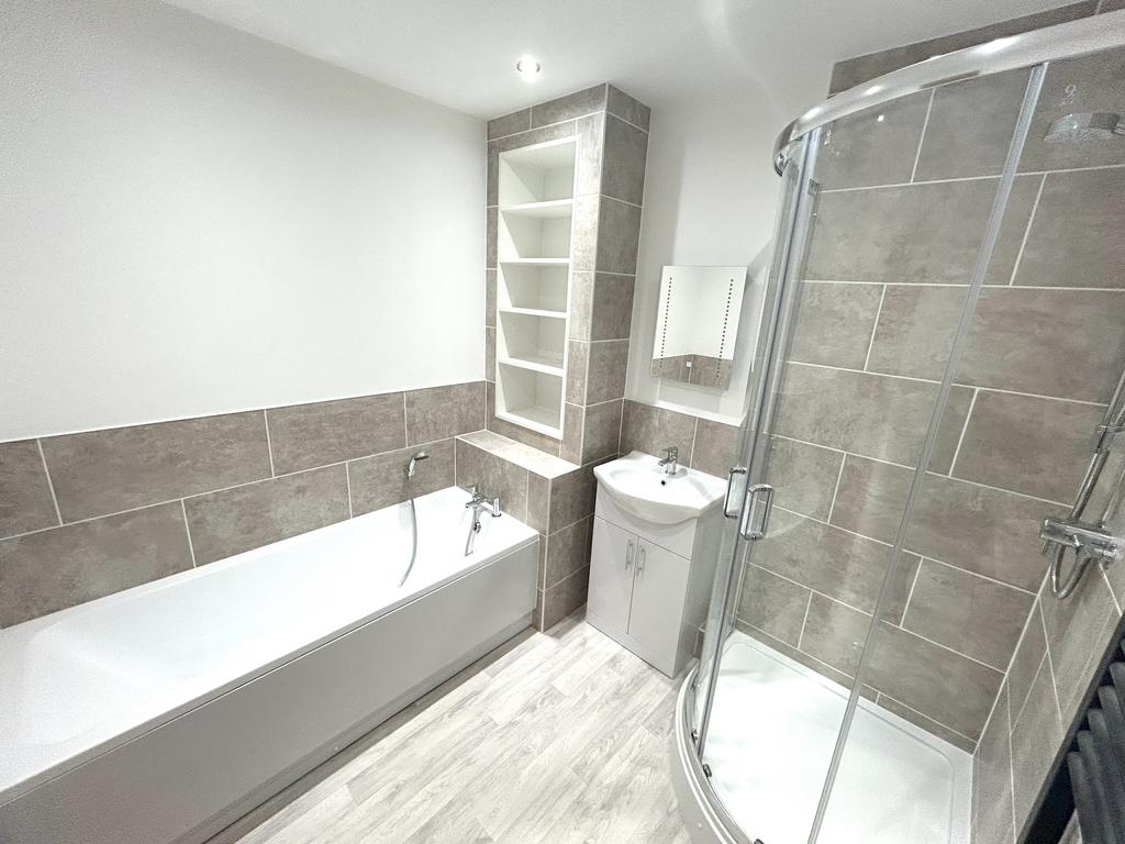 The hallway leads to a luxurious, brand-new bathroom. It is beautifully finished with earthy-toned tiling and features both a full-sized bath and a separate curved glass shower cubicle. The space is further enhanced by a modern vanity unit, a heated towel rail, and clever recessed shelving for toiletries.