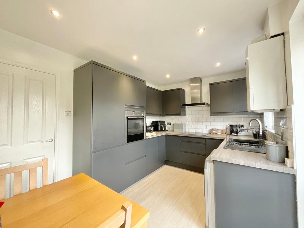 To the rear is a modern and well presented kitchen/diner fitted with contemporary grey matt wall and base units, offering excellent storage and worktop space. The kitchen includes a four-ring induction hob, built-in oven, plumbing for a washing machine and an integrated fridge freezer. There is ample space for dining, making it ideal for everyday family life and social occasions. French doors open directly onto the rear garden, allowing plenty of natural light and creating an excellent indoor-outdoor flow.