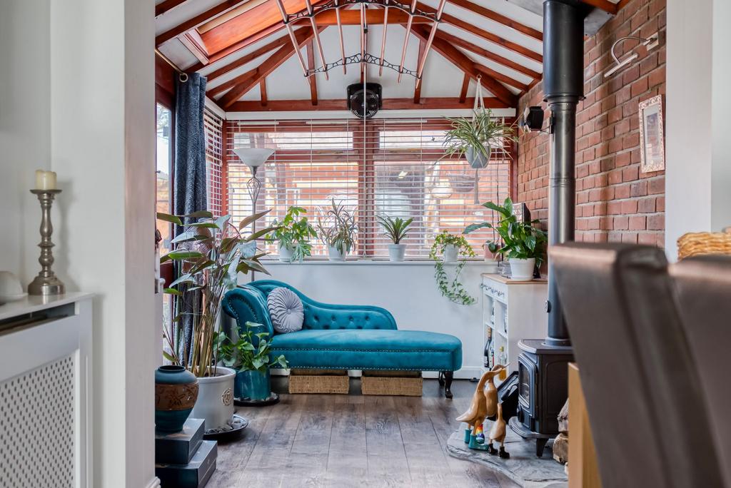 A particular highlight is the cosy snug, accentuated by a high vaulted ceiling that enhances the feeling of space and character. An exposed brick feature wall and wood burner form a striking focal point, bringing warmth and texture to the room. The current owner has thoughtfully installed a discreet ceiling-mounted drying system that lowers in front of the wood burner, a practical yet unobtrusive addition during cooler months. French doors open directly onto the garden, allowing indoor and outdoor living to blend effortlessly.