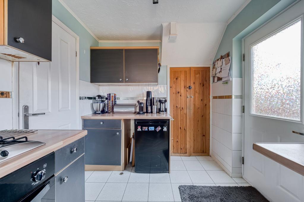 - Kitchen equipped with modern cabinetry, an integrated oven, under-counter areas for appliances and an under-stairs storage cupboard