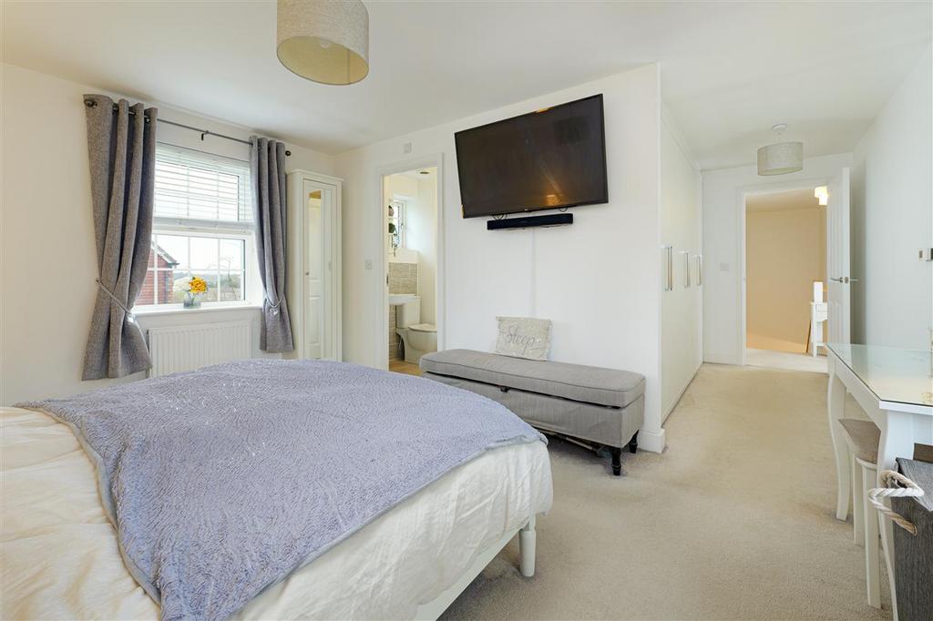 Upstairs, a central landing leads to five generously sized bedrooms and a well-appointed family bathroom. The principal bedroom boasts an expanse of fitted wardrobes and an en-suite shower room, while the second-largest bedroom also enjoys its own en-suite.