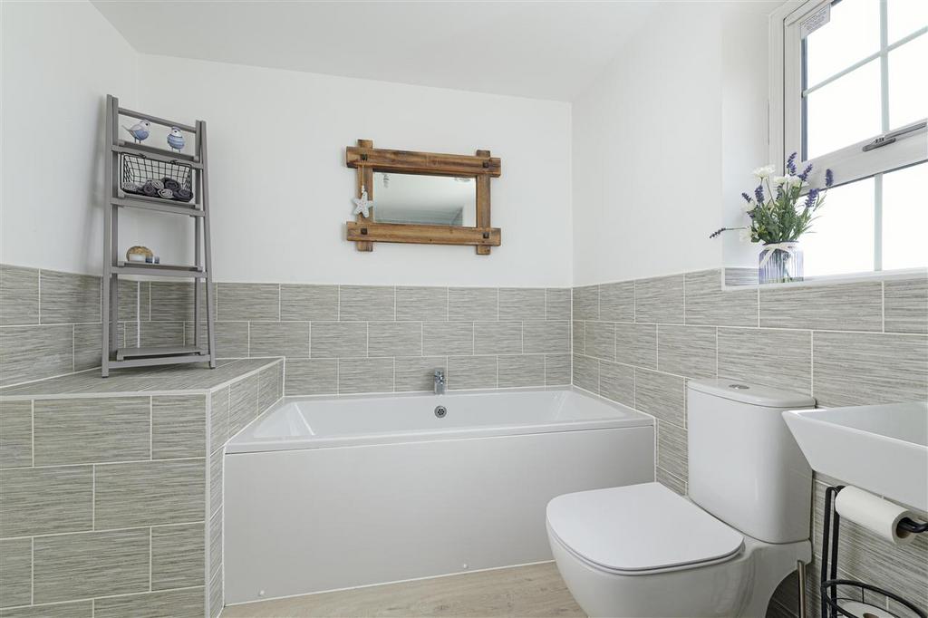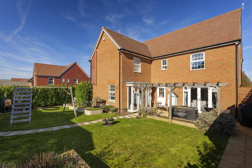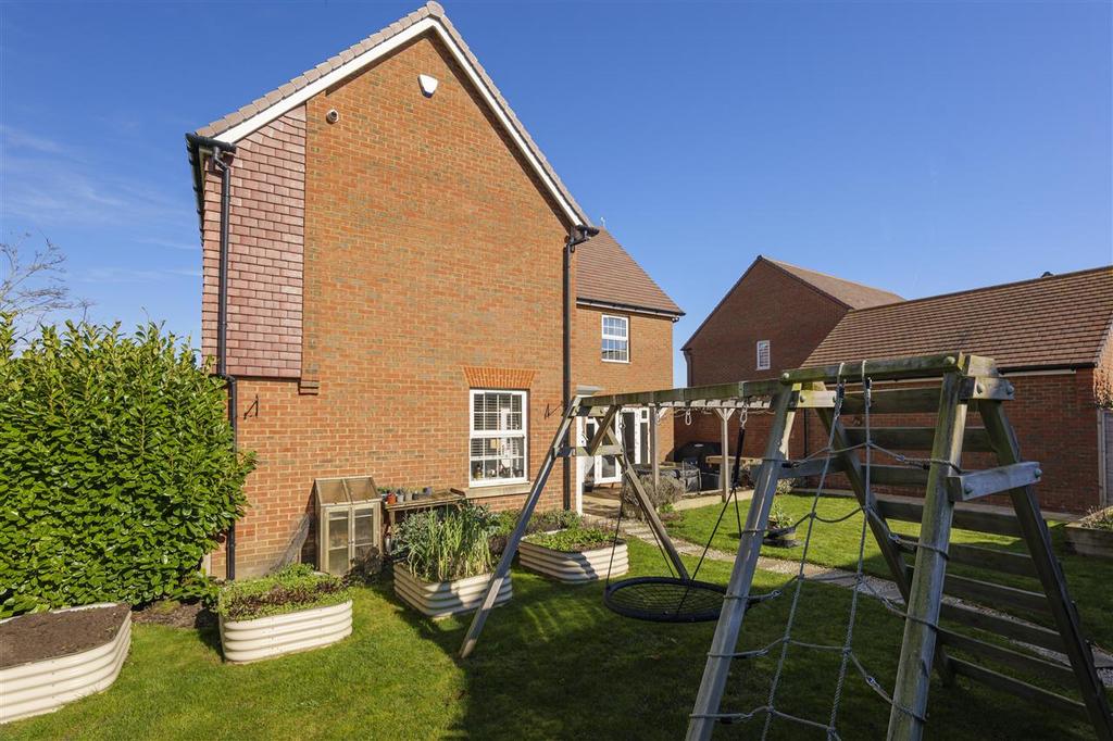 The south-facing rear garden spans the full width of the house and is accessible from both the dining area and sitting room. The extended terrace offers ample space for alfresco dining, enhanced by a pergola with festoon lighting that creates ambience and dappled shade. The remainder of the garden is mainly laid to lawn, with raised beds, mature hedging, and a hot tub that could be included in the sale. A pathway leads to the rear gate, providing access to the parking area and double garage.